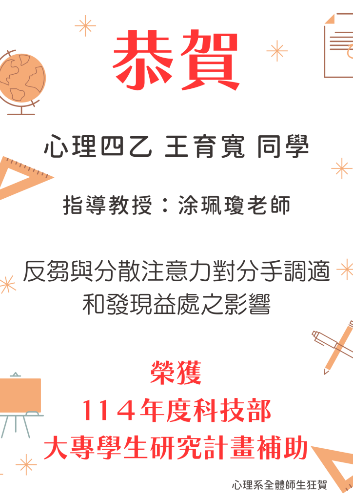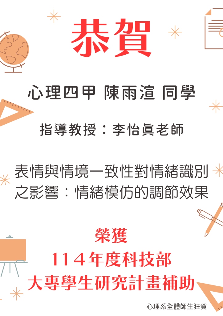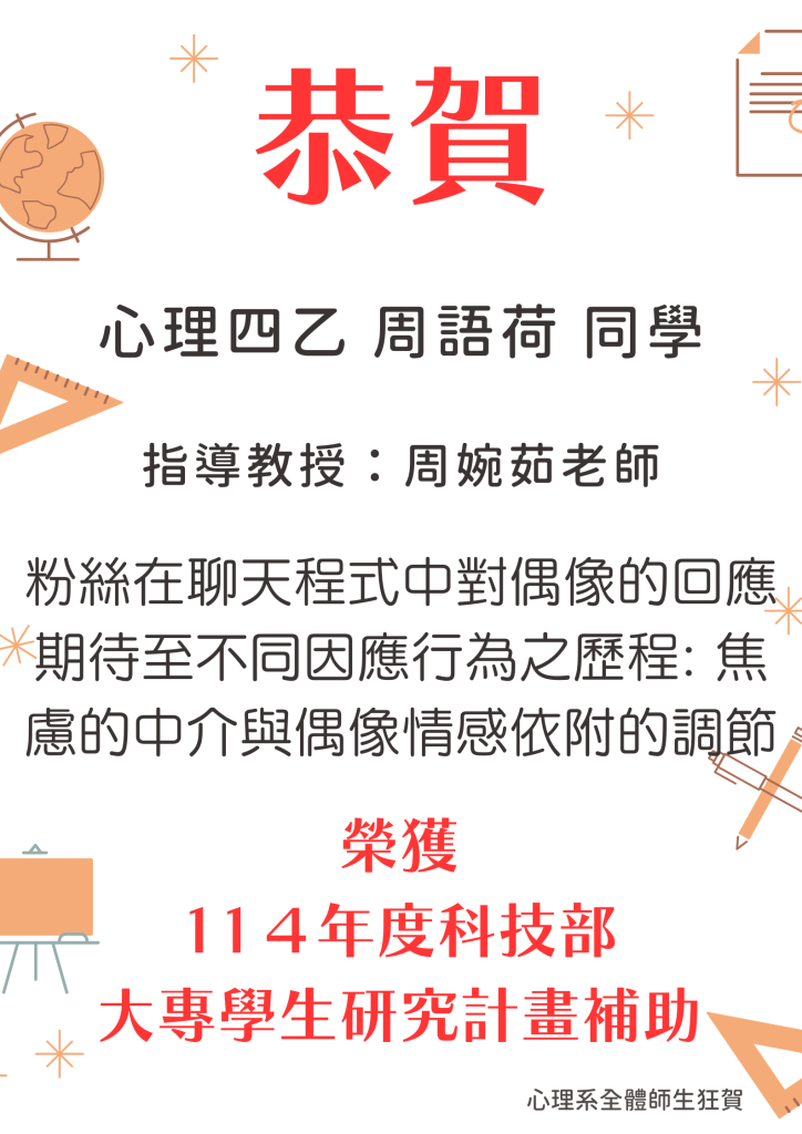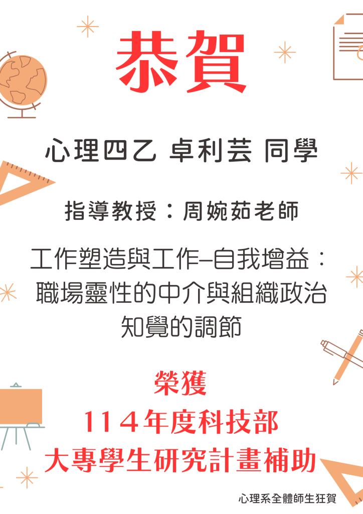 恭喜 卓利芸、周語荷、王育寬、陳雨渲同學 通過【114年度科技部大專生研究計畫補助】