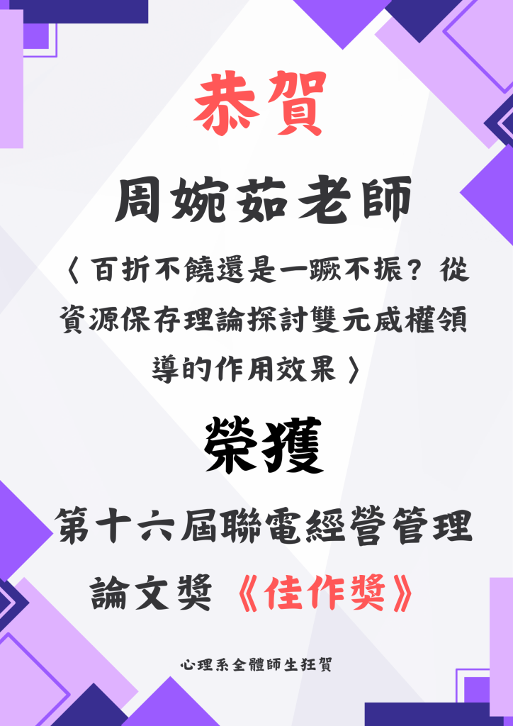 恭賀 周婉茹老師 榮獲聯電經營管理論文獎