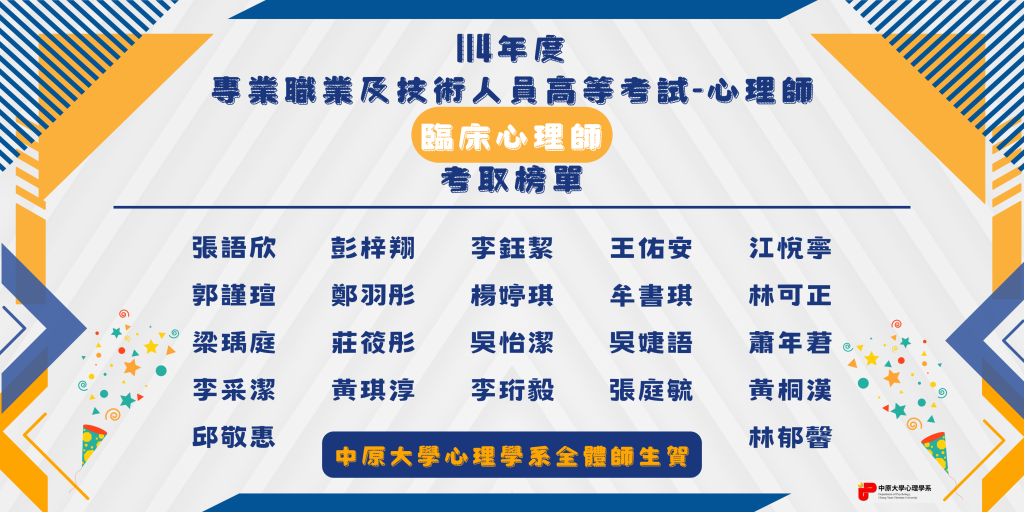 恭賀 張語欣、郭謹瑄、梁瑀庭、李采潔、彭梓翔、鄭羽彤、莊筱彤、黃琪淳、李鈺絜、楊婷琪、吳怡潔、李珩毅、王佑安、牟書琪、吳婕語、張庭毓、江悅寧、林可正、蕭年莙、黃桐漢、邱敬惠、林郁馨同學 通過114年第二次專門職業及技術人員高等考試-臨床心理師考試