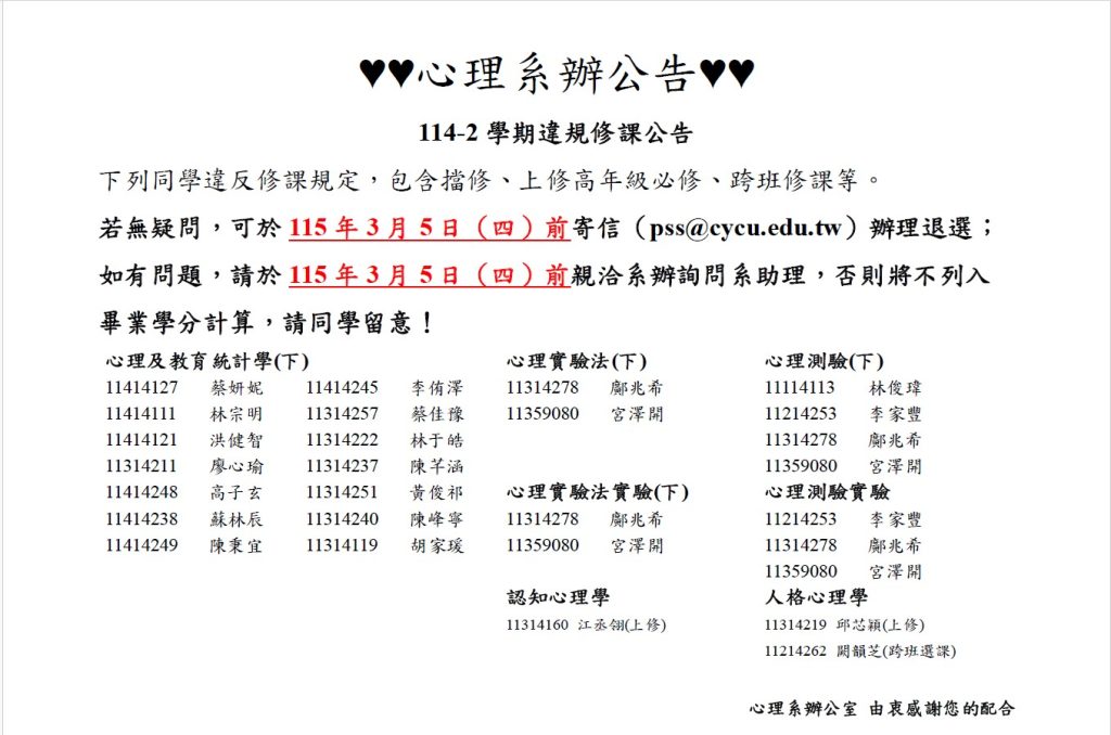 違規修課公告,請於115年3月5日(四)前向系助理聯繫,否則將不列入畢業學分。