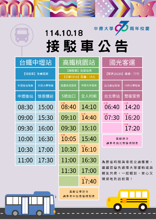 Ø若校區車位已滿,將引導校友至中原國小地下停車場,10/18(六)當天8-17時,出示貴賓停車證、校友證或校友日電子邀請函,可免費停放該處,逾時請校友自付額外費用。
