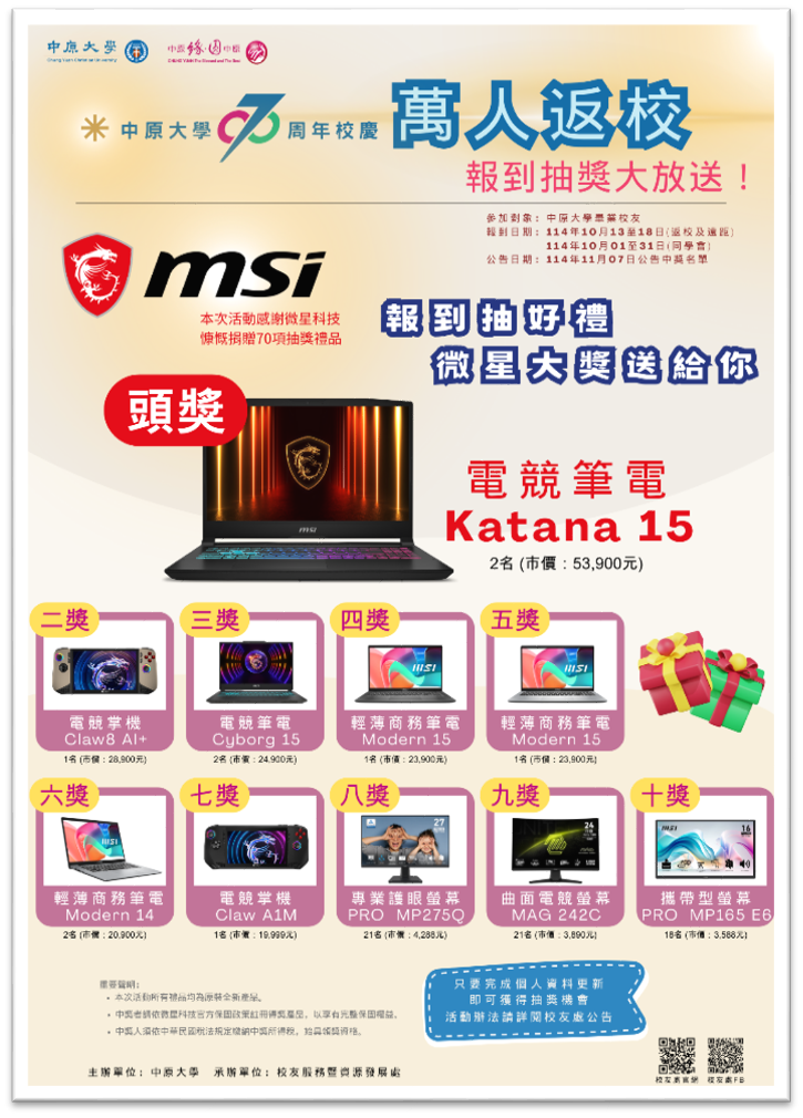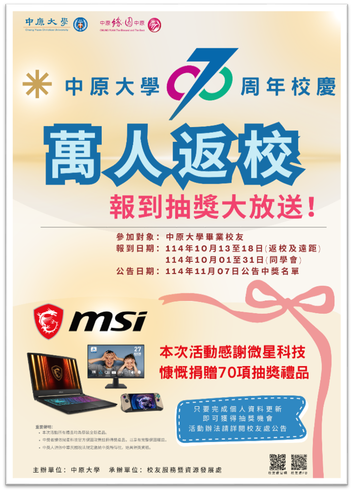 Ø歡慶中原大學70周年校慶!凡於校慶期間完成報到者,即具「萬人返校報到抽獎」資格,共有70項好禮