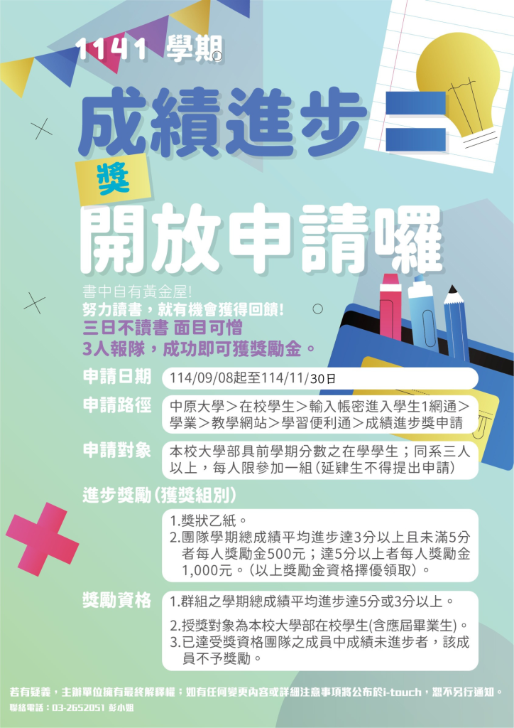 114-1成績進步獎延長申請至11/30(日),請同學們把握機會!!