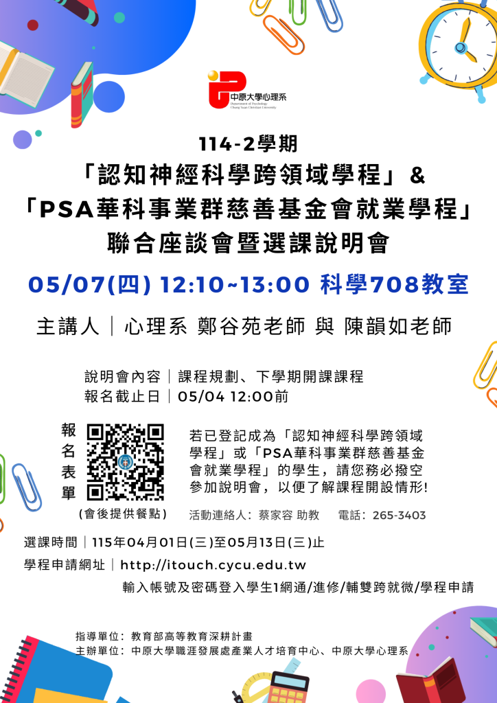 114-2學期「認知神經科學跨領域學程」&「PSA華科事業群慈善基金會就業學程」聯合座談會暨選課說明會