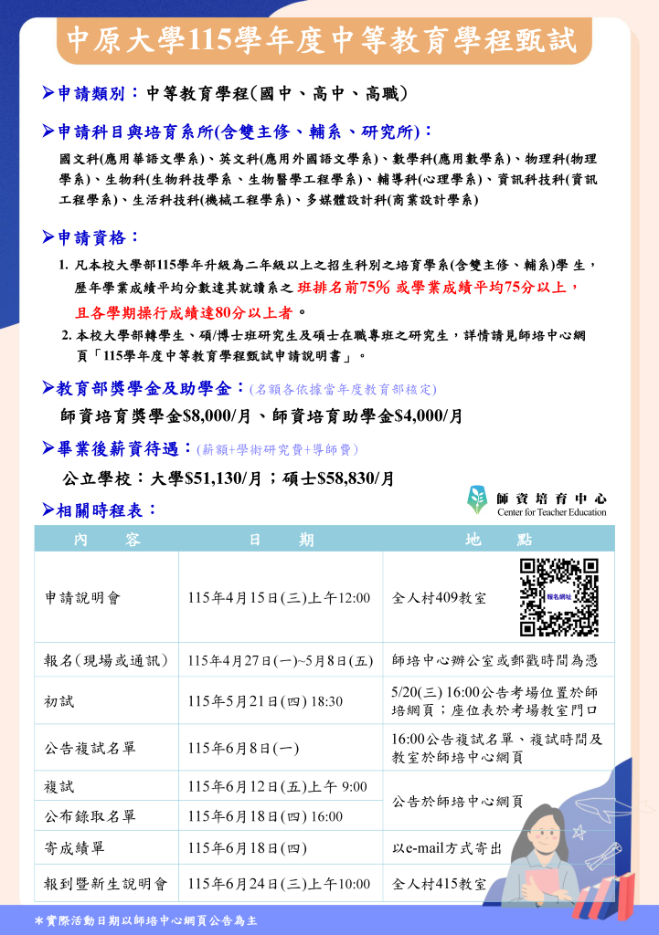 115學年度中等教育學程甄試,自115年4月27日起開放報名