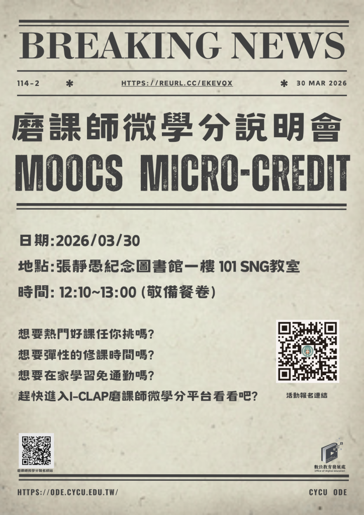 數位教育發展處將於 115年03月30日(週一)12:10–13:00 於圖書館101 SNG教室 舉辦 「114-2 磨課師(MOOCs)微學分說明會」,說明微學分申請規則、採認流程與常見Q&A,協助學生規劃跨校/外部優質線上課程之學習路徑。